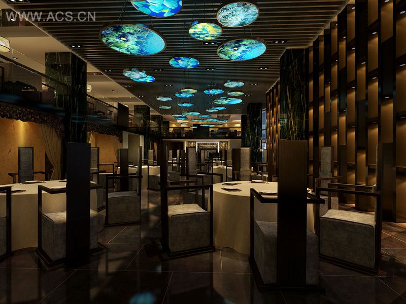 大厅天棚上错落有致的绸质吊灯是此区域的亮点,其上的海洋鱼类高仿真丝印与该项目主题又有了呼应,既具有较强的视觉冲击力,又使客人们在用餐过程中可随时产生身临海洋世界的美妙感觉。再加上线条简洁而又略带禅意的餐椅,实木雕花门拱,粗陶罐及水池中的睡莲等精心配置的小品,使整个空间具有既深沉内敛又奢极至简。