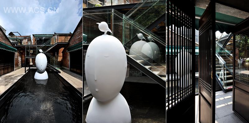 该项目是由九个外型独立大小交错相连的院落组成,这些建筑群体现出中国民居的原乡特色。强化中心轴线,以精心设计的中轴串联不同功能的建筑群体,即便是酒店内部也将以现代中式风格来延续本地历史及文化的脉络。中轴线上的主入口以“拱门”形式引人入胜,仿佛进入桃源般的心旷神怡,将喧嚣的外部都市过渡至幽静的内部酒店空间。庭院中趣味雕塑、流水,辅之以传统青石铺就的过道,防腐木的台阶,LED灯勾勒的玻璃拦河,将不同的院落巧妙地连接起来。夜晚时分,奇特的灯光闪烁,令人体验到时光交错,昔日重来的感觉。
