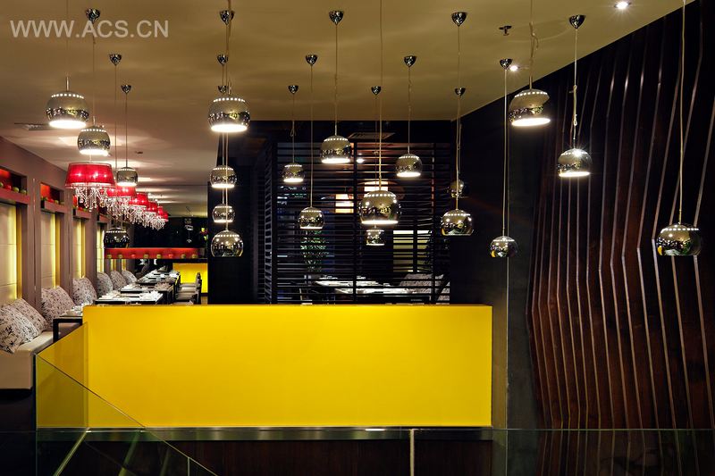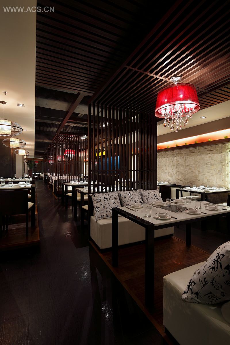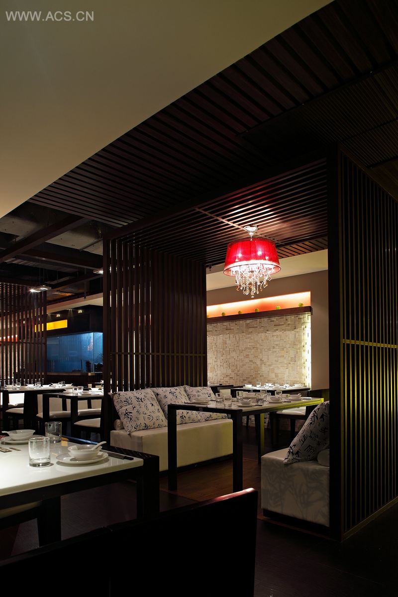 舞动空间、追求自然。在这个餐厅空间设计中,设计师较多运用了自然而独具乡间味道的材料。无论是竹叶还是绿可木,抑或是临窗摇曳的竹子,空中悬挂的灯笼,或是参差不齐中还带有秩序的窗帘……是乡间的色彩,自然的味道。诸多咖啡色调会不会太沉闷了呢?所以设计师巧妙运用了水晶灯,奢华的款式与时尚的色彩,使它充分起到了画龙点睛的作用,它不仅提升了空间的时尚感,更聚焦了食客的眼球,正所谓万绿丛中一点红。