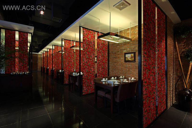 设计在材质运用上采用红砖、老粗布、干竹、中式花格、水泥拉毛等等,使餐厅空间显得格外亲切与质朴。餐厅的大环境全部用红砖墙做背景,其中干竹在这里点到为止与红砖墙遥相呼应,且统一又富有变化。