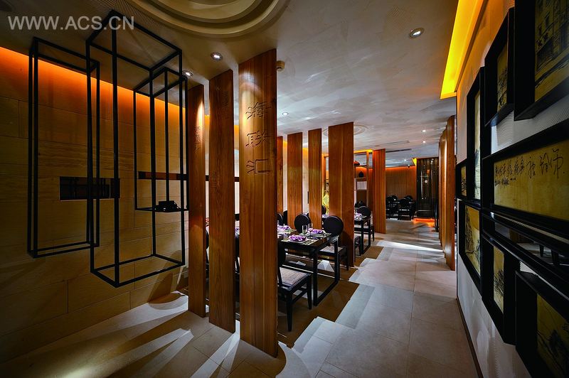 或许是源于“海联汇”的名称,设计师根据业主的要求,将“水”和“海”的概念作为餐厅设计的主题。在所有象征海、水概念的元素中,设计师以水波的圆弧纹理为灵感,将形态、大小、组合方式不一的“圆”呈现于空间各处。有别于一般意义上新东方空间的华丽感和复古性,海联汇更讲究陈设、配置和对商务空间中人文气息的营造,着重于控制空间的品味,在拥有精简传统中式元素的同时,又不失东方意境,让我们感受到其内敛的中式禅意。