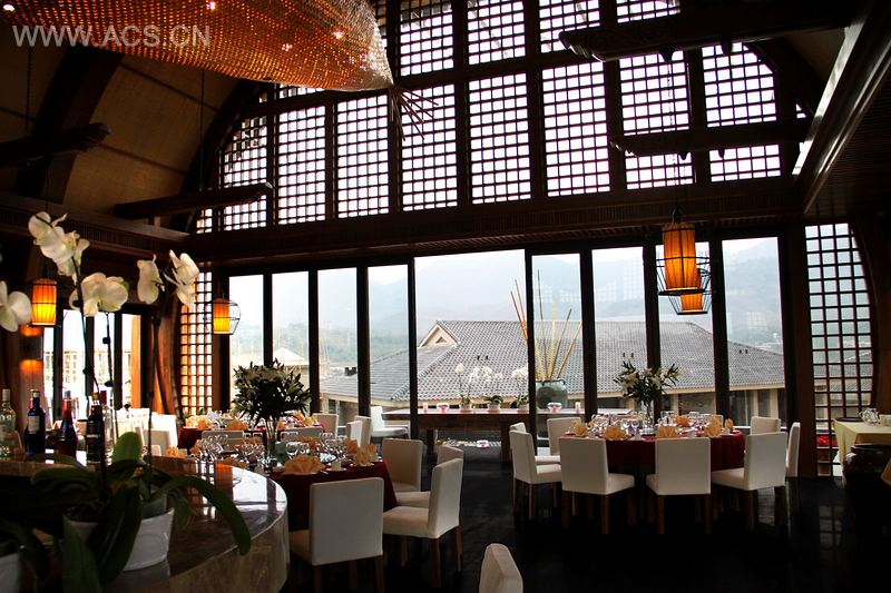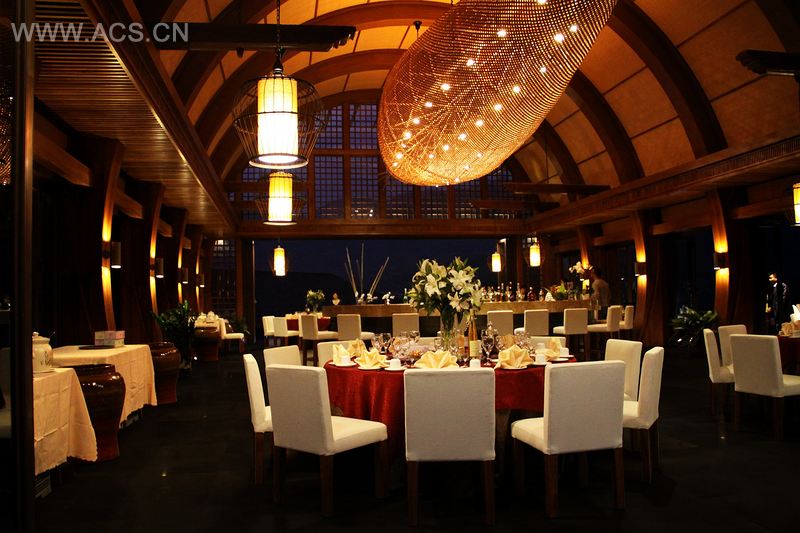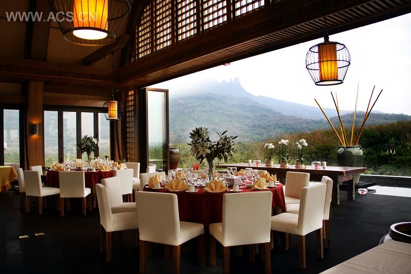 海南七仙瑶池三楼船屋会所的建筑外观就是一个船屋的造型,从远处看,好似一艘巨型船屋,飘荡在白云薄雾间,与远处七仙瑶池如梦如画的风景相得益彰。而这一创意的灵感来源,正是来自于当地的船形屋,一种当地黎族的传统居住房屋。它的形状如船蓬,由竹木扎架构成轮廓,盖以茅草而成。同时作为西餐会所,她的档次和品位绝不逊于世界顶级酒店。以椭圆形的吧台为中心,人们可以围坐在这里,无论是家庭聚会、三五好友,还是情侣,都能找到最适合自己的位置。船屋四周全部是可以完全打开的折叠门,完全开放的空间把室内外美景全部据为己有,虽在室内却感觉置身群山从林中。