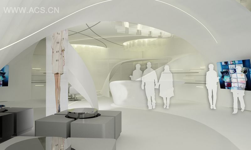 室内线条、天花板和地面上的线状LED灯代表风的动态。室内结构、家具及陈设以一种水的形态进行布置。半透明薄膜饰物悬挂于天花板,当风吹过时便随风摇摆,使得整个天花板都生动活泼起来,并引发这人们无限的想象。它看起来像云或是其他抽象的东西,但是却使得整个空间更加有趣。