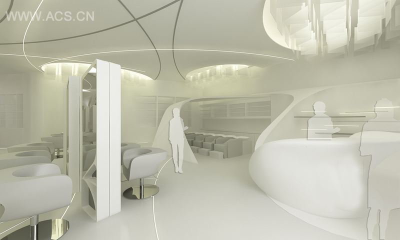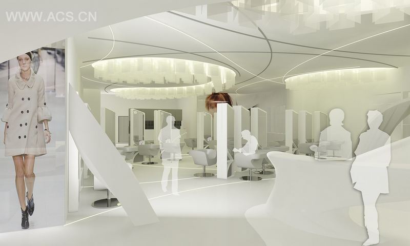 这个美发沙龙的灵感来自于风与水:风的生机和水的纯净。这两个元素几乎出现在所有美发沙龙中。我将风的动态感和水独特的平静波纹进行诠释再创作,将它们融进了空间设计中。