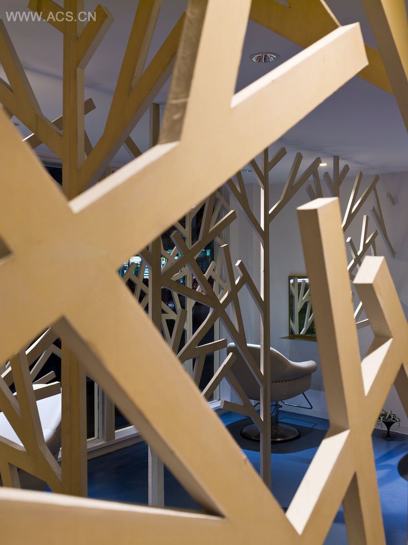 这个小店仅有46m2,但要分隔成洗发、剪发、等候3个区域。因此墙的厚度需要细细考量。我们选用24mm的胶合板作为3个空间的分隔墙。墙可以帮助合理划分地面空间,并形成每个区域的流通范围。这些分隔板被设计成树木的形态,它们有些在店内交叠,一些空间点上相互交错形成了立体树木。这些树木或是2D或是3D的形态创造出一种繁复的空间感。