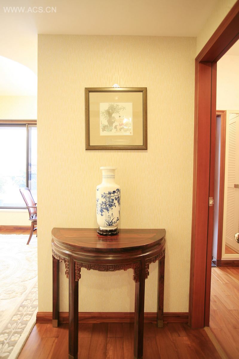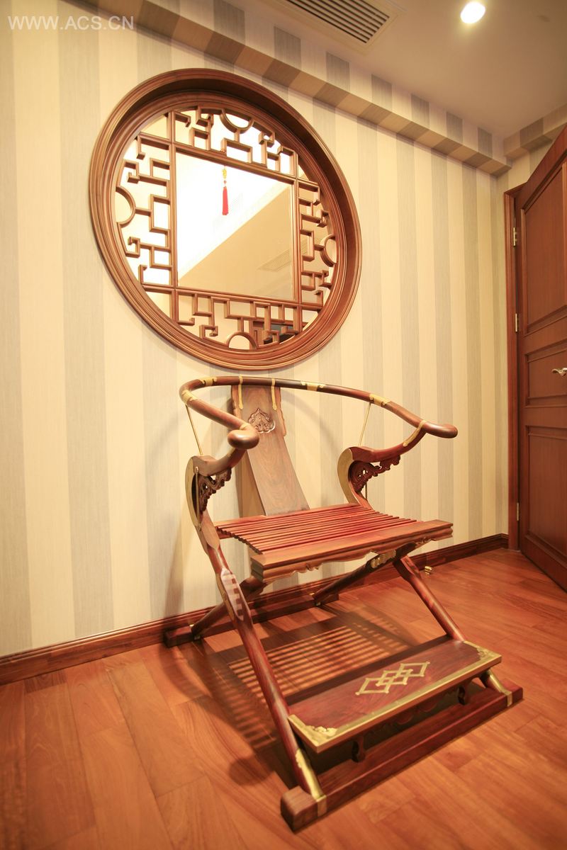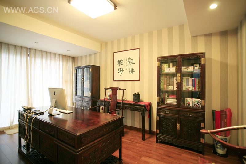 业主非常喜欢收藏,尤其对陶瓷及古典家具的情有独钟,所以地下一层作为收藏、展示、交流的功能定位,在设计上更偏重于中式的体现。整墙的瓷器展示架大气沉稳,与明式圈椅案台形成对照,共同营造出深厚的文化内涵。一层的客、餐厅以简捷明快的现代手法,局部略施精致的窗格及飞罩,“万”字形的造型,不仅表达特有的文人气质,同时寓意房主大吉大利、万寿无疆的思想内涵。二层小孩房装饰上以现代手法表现简洁明快。三层的主卧房高挑的斜屋顶暗藏灯带与墙面造型呼应,侧面书房米灰色调营造整个空间氛围,现代又不失文化情调,充分表达业主积极向上的人生品格。