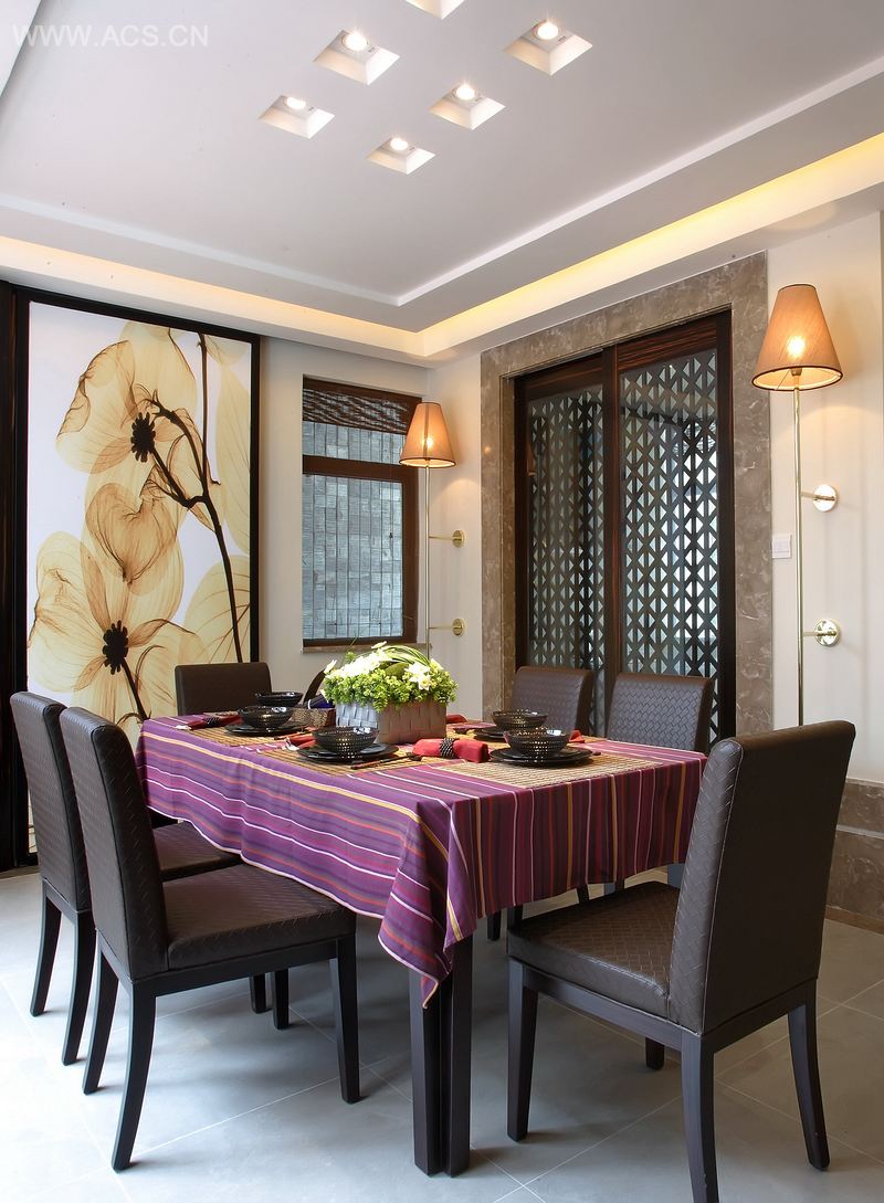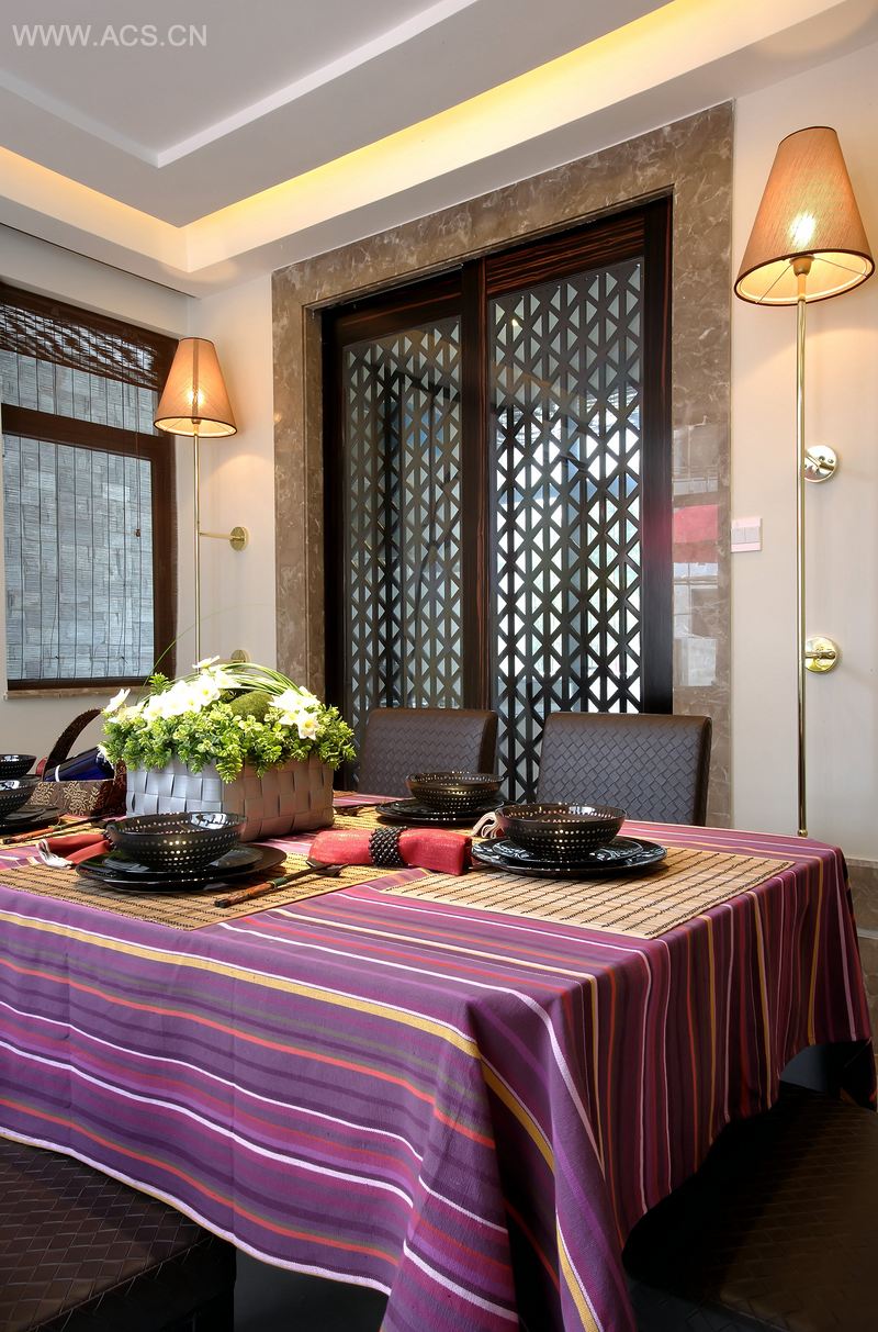 整套设计走的是“新东方主义风格”路线,以传统的深棕色为主色调,用白色墙面打底,使得整体古朴而自然;另以些许亮色系桌布、靠垫等来协调整个色调,配以暖黄灯光,室内显得尤为和谐、温馨。此番设计亦将现代的几何元素和传统元素结合在一起,以现代人的审美观来打造富有传统韵味的空间。