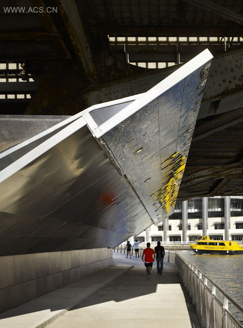 在河流水平位上与稍低的维克大道并行的新建芝加哥沿河大道作为一处大型公共便利设施,起始于密歇根大道并向西延伸至雷克街。这个沿河大道完全建好后,将为人们提供各种便利和公共活动区域。遵照着芝加哥市政府对沿河发展项目的指导原则,这条大道上包括了复古灯架、盆栽、栅栏以及其他的一些元素,在为市民、游客和那些喜欢到河边游玩的人们(河流穿过整个芝加哥市)创造一流设施的同时,也提供了追溯这个城市历史的标致性联系。沃巴什纪念广场是芝加哥沿河的一个新焦点。它为城市中心打造了一个绿色港湾,并在位于上方的维克大道与将来的河岸开发项目之间创建了一个至关重要的联系。由于维克大道的重建和迁移,这个广场形成了一个新的城市公园,阶地和沿河岸线的坡道成为连接忙碌城市街道和这个更为安静的沿河空间的平缓过渡。景观区和草坪缓和了原先维克大道设计时留下的石灰石和花岗岩柱子、壁柱、壁顶和檐板造成的冷硬氛围。芝加哥越战老兵纪念喷泉极具教育意义和象征性。沿着维克大道,一面水墙插入石灰岩墙中,水花溅到与上方广场喷泉相应和的池子中。池子边缘刻有记录着越战时期重大事件的时光轴线。战争中牺牲的伊利诺斯州士兵的名字与时光轴线平行刻录,每个名字都连接着一个永恒的瞬间。
