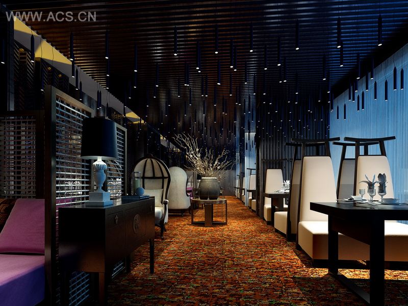 此咖啡厅为当地四星级酒店所打造,东南亚融合风格,吊顶使用点线面具有延展性的造型,家具形式组合具有多样性,给人柔美及恰到好处的感受。
