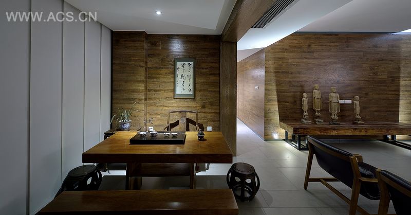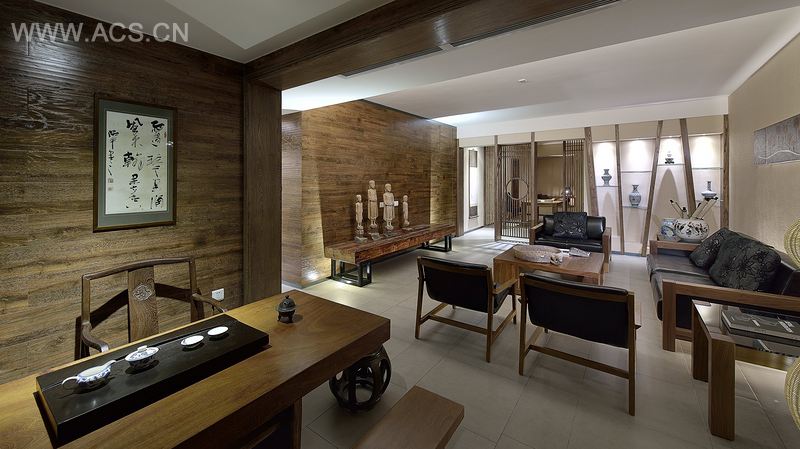 本案要求营造一个简约又不失奢华,安定祥和,一种能让人回到家心就能静下的空间。为营造这种氛围,设计中在空间上大胆规划,在满足舒适安静的睡眠空间前提下,在公共空间上创新,用简单的设计符号,用传统的移步换景的空间手法,勾画出了简单的、奢侈的空间。如悠闲的前茶室、简约开放的厨房餐厅、宽大又不失时尚的客厅、犹抱琵琶半遮面的书房、意由心生的后休闲阳台。各空间的融通贯穿营造出的禅意是本空间的精髓。