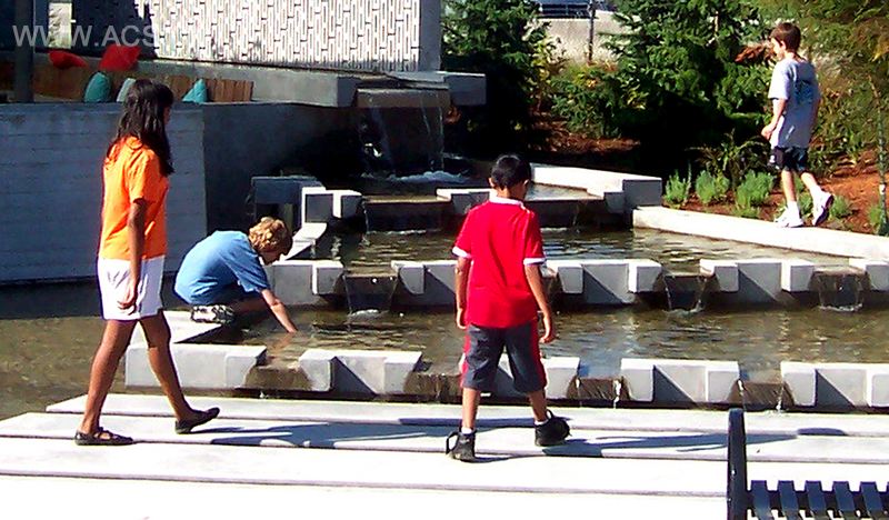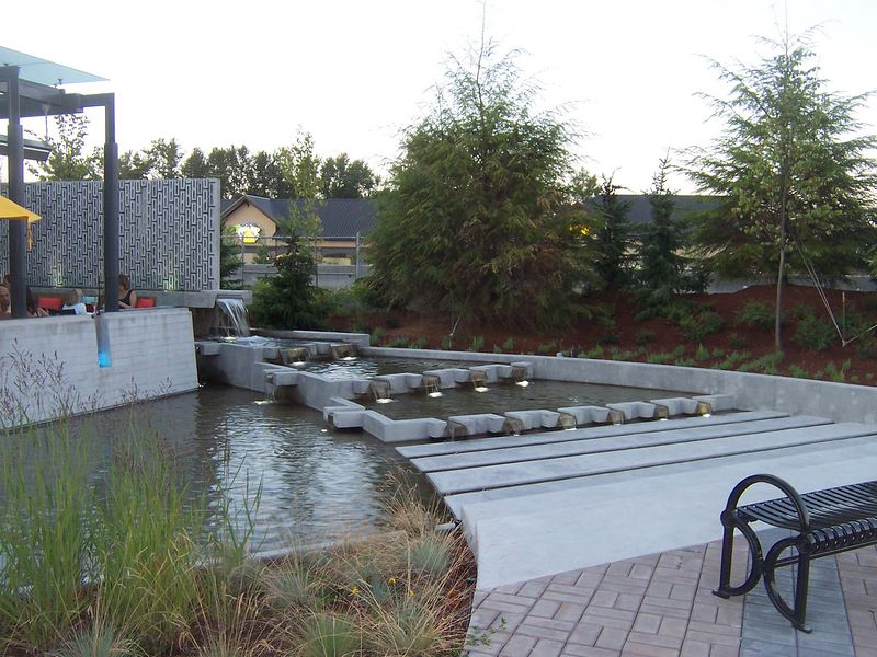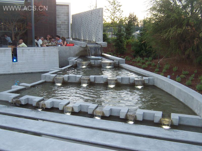这家著名的餐厅离一个繁忙的公路很近。这个设计的目的就是为了满足这家餐厅露台创造一个良好就餐环境的需要。伴随着赏心悦目的瀑布声音,水景观提供了一个优美的环境。一个种有植物的坡台把这个露台和高速公路隔离开,明显的从周边路上过来的噪声污染。一系列带灯光的瀑布般落下的水池以及浅水池,被设计的非常具有吸引力,而且很有趣味,成就了这个餐厅的成功。对细节的注重以及设计上的实用性,让维护和保养变得很容易。最低的浅水池的边缘是圆形的,这就让一些小动物(例如小鸟)能够到池边去喝水。