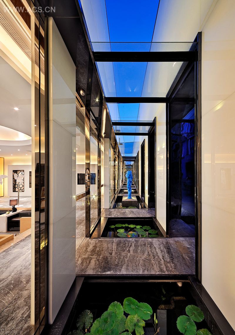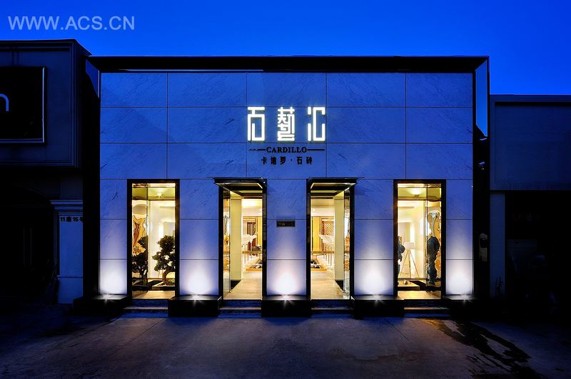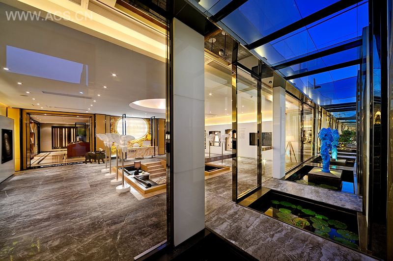本案为大理石复合板展厅,从其产品的性能特点引入设计思维,为使产品展示全面化并贴近生活,“简约”成了这次设计的中心词汇。采用“面”的区分法,利用黑钛、槽钢、方管、木面烤漆等,将门头及大厅展示墙立体化,即抛开原始的墙面展示,也不采用古板的层架展示,从而更精致地表达产品本身,给人以干净、硬朗的感受;独具匠心的过桥入户水景观设计,打造“小桥流水人家”的倾心体验。此间应用到了下沉式的方形接待区,让空间赋有层次感;更利用圆形天景引入自然采光,与下沉位置相互呼应,无规矩不成方圆亦是设计精髓所在。