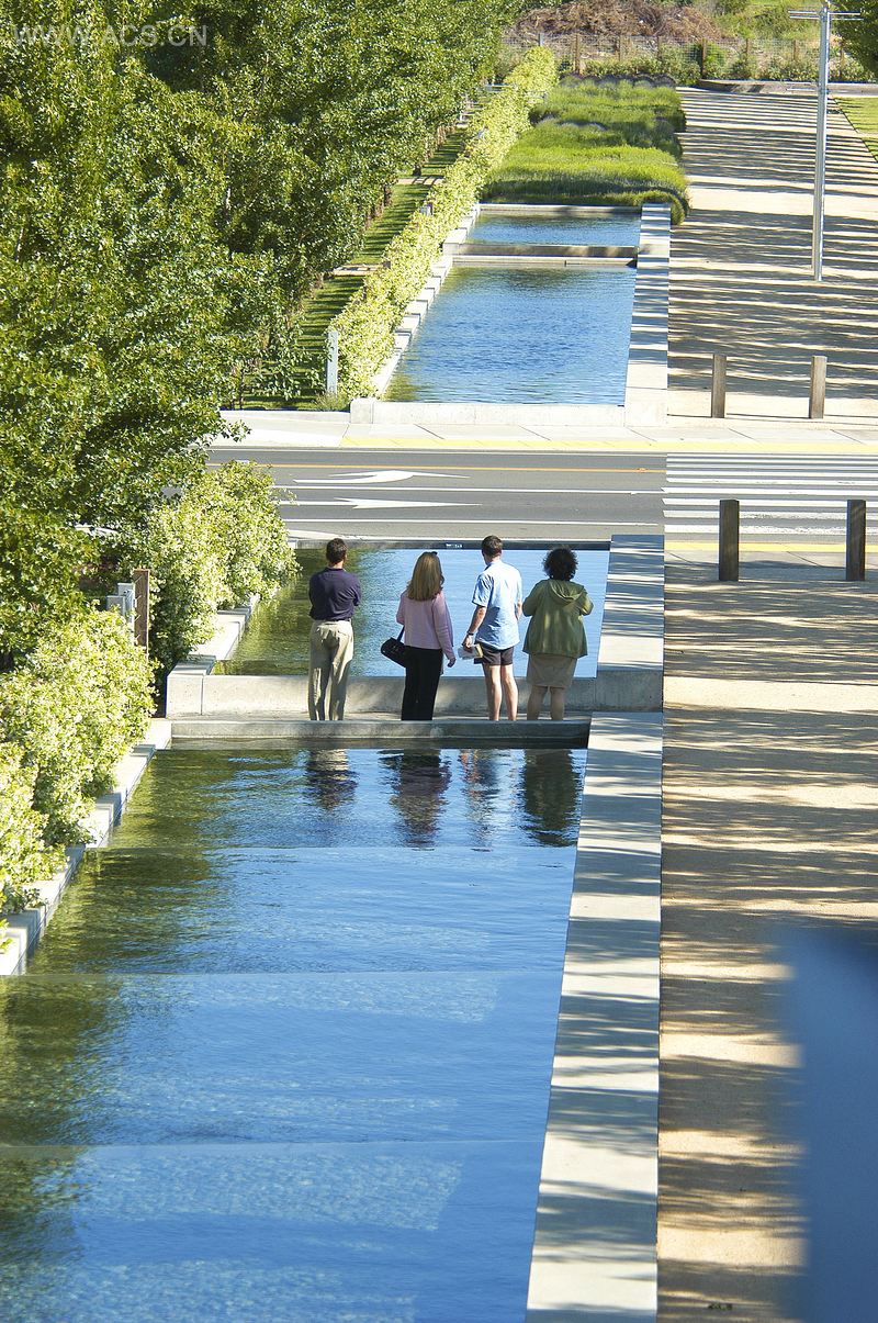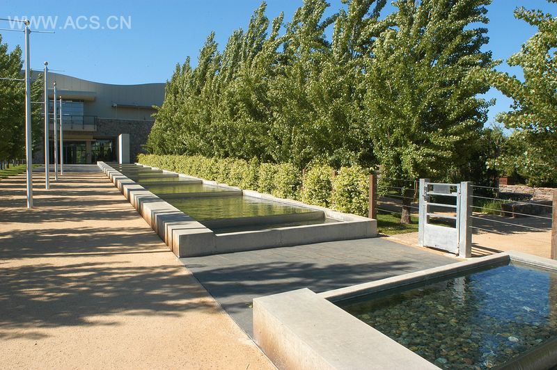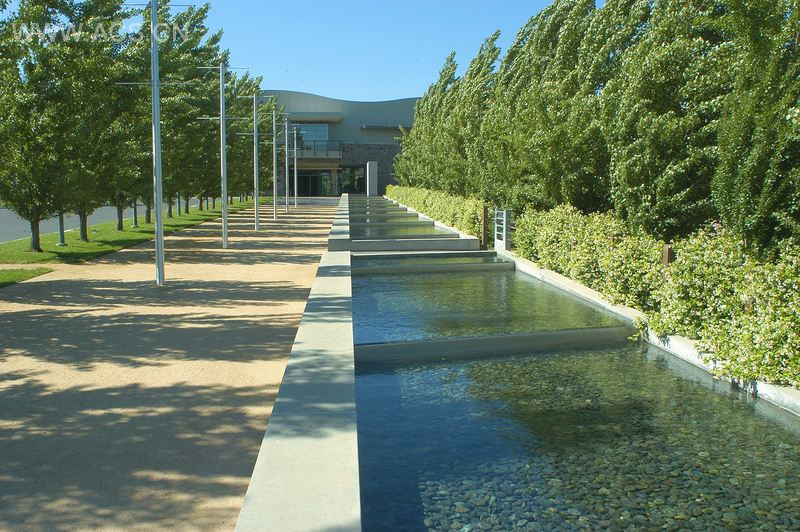 PWP公司设计的景观适应有着密集的公共建筑包括餐厅,音乐厅,展厅和讲述加利福尼亚文化中最著名的方面的讲座。 坐落在纳帕河u型河床上,博物馆位于地面高地,花园和河流边缘都被精心设计过了以控制洪水泛滥。主入口是一个825英尺长的砾石小道,道路两旁都种有高大的杨树,在东250尺长的阶梯式的反射池。石头边的展示花园被草坪小路分成许多小块土地,种有加利福尼亚当地季节性的水果,蔬菜和观赏植物。停车区域都种有葡萄藤和当地草皮。该景观—包括有一个户外圆形剧场和几个用餐草地区—用来庆祝和培育该区域生态遗产。