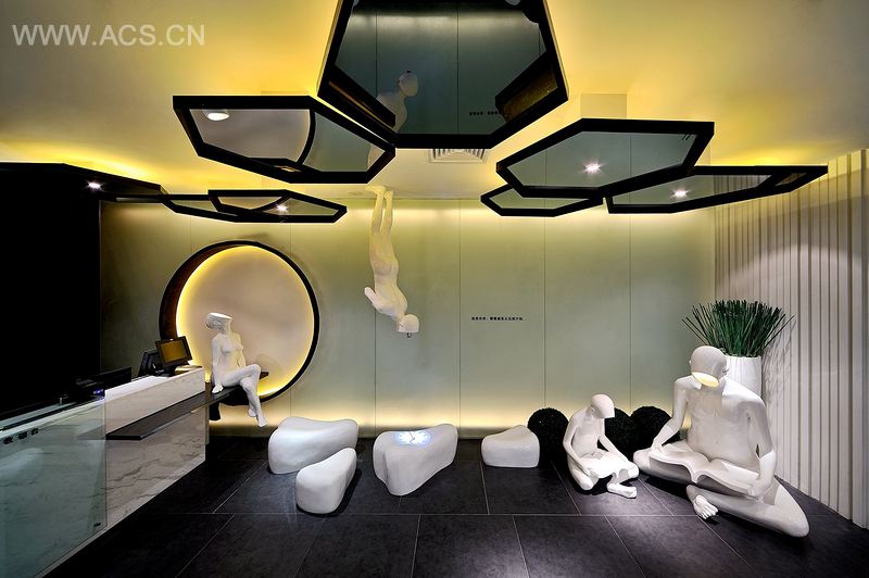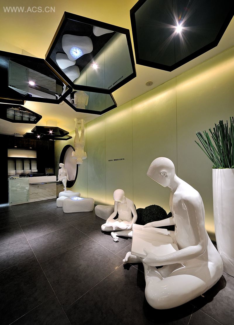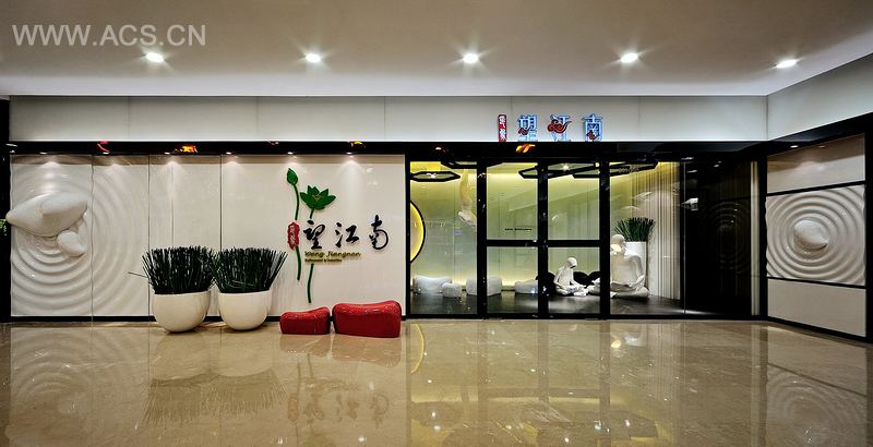入口大厅的处理是本案的出彩之处,以玻璃钢雕塑或站或坐的各异姿态,加上乳化玻璃发光墙,时尚现代感与东方气质的碰撞,为整个餐厅增添许多各异的色彩。
