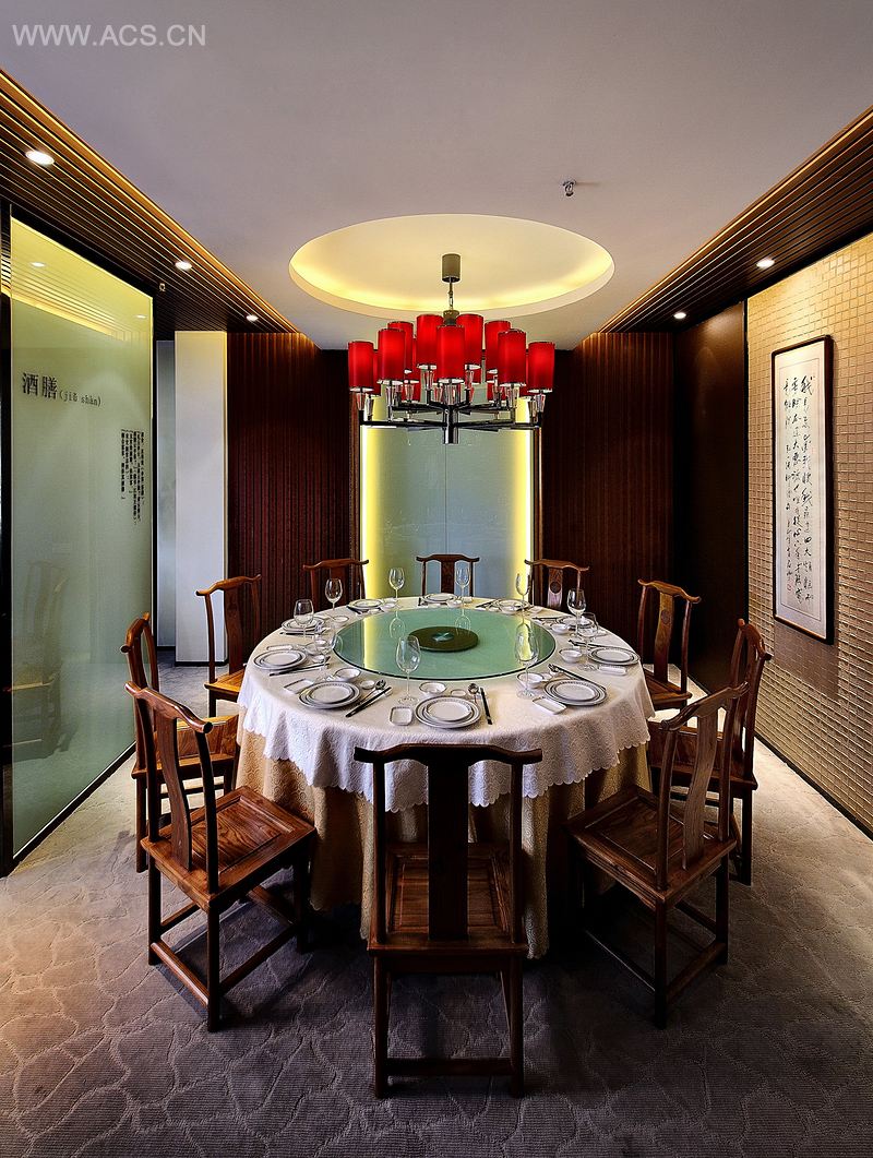 卓悦酒庄的设计实践,对传统文化价值较为理智的发挥。将传统和现代融合在同一空间内,创造出一个温暖、华贵、宽敞、吸引人的空间。进门处墙面的皮革与毛绒地毯巧妙配合其儒雅不失华丽。精致的毛绒地毯和简单的手工制作不锈钢扶手给人带来一种强烈对比的平衡与顶级的享受。