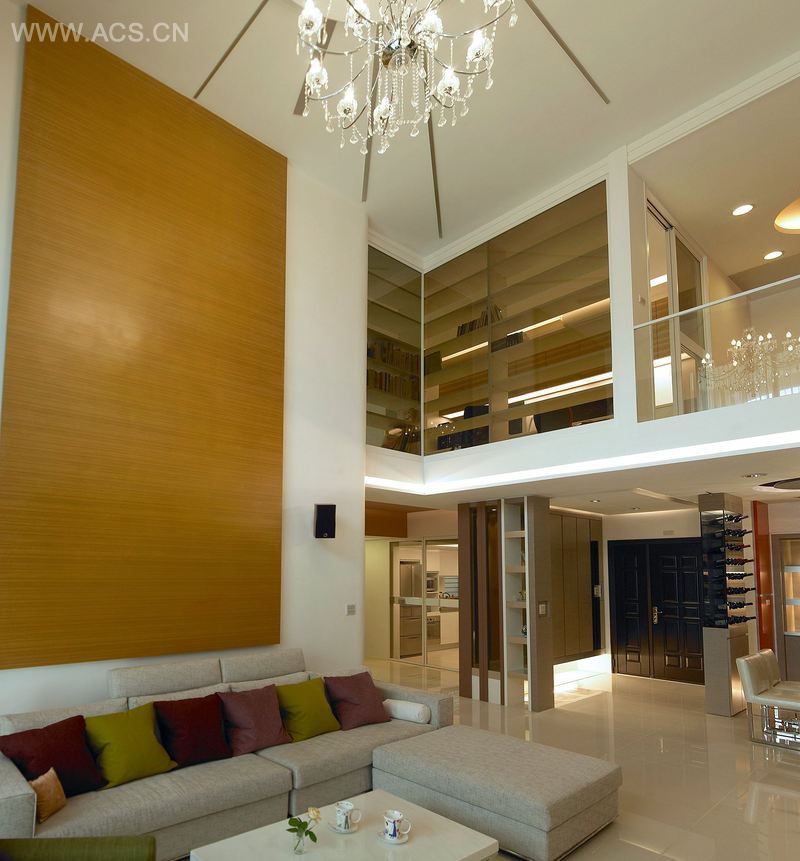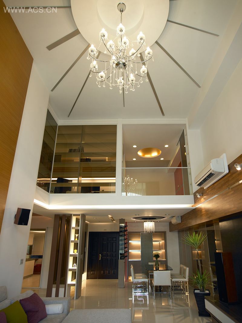 设计师利用客厅挑高及楼板高度3.2米的优点,让公共科技以开发的表现方式,利用清玻璃作延续视觉的效果,有效的制作出空间里应有的简约秩序,缔造相当沉静,纯粹舒适的场域关系。