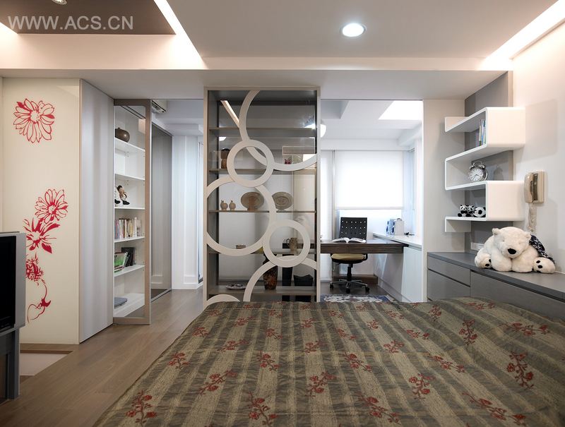 楼梯旁配电箱以茶镜包覆,除了修饰,更能发挥镜面扩张效果,色泽沉稳而有格调,适度的提升空间之质感。二楼为机能十足的复合式私密空间。书房与卧房利用茶玻拉门与展示柜分隔,在通透与独立之间取得平衡,藉此让空间与空间各具自主性。