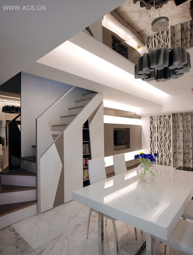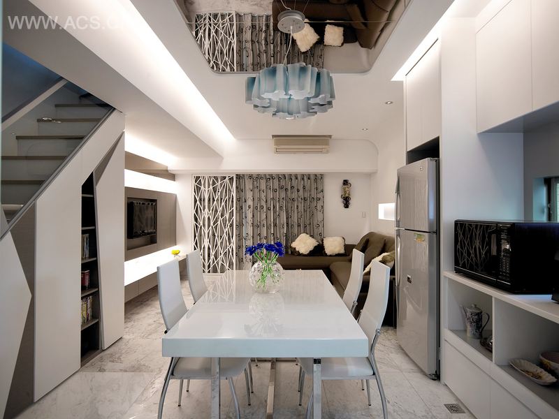 本案为楼中楼设计,需容纳一座楼梯,因此,有效分配使用空间及如何制造轻盈的楼梯,成为设计师的两大突破重点。