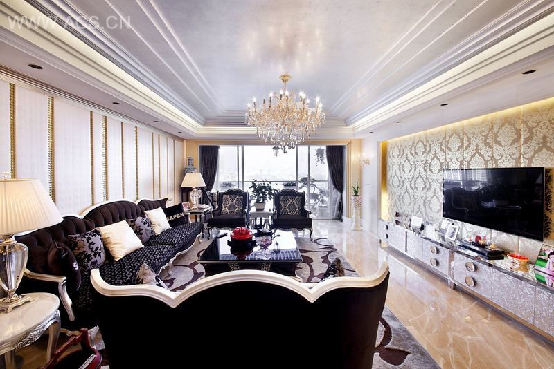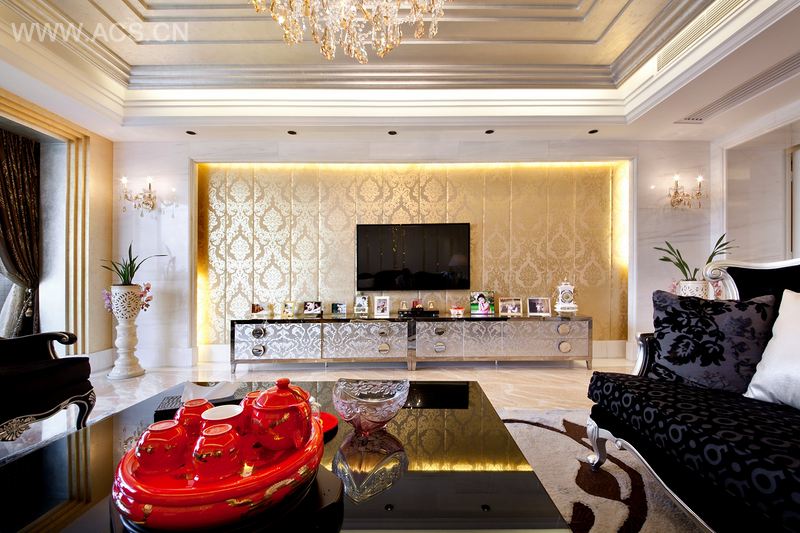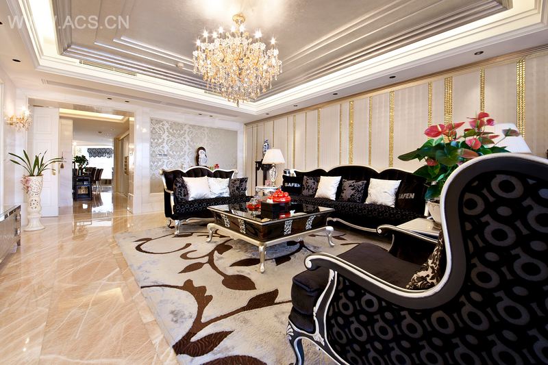 在空间的处理上,硬装整体以白色、金色为主色调,在家具等软饰搭配上,主要用重色调加银箔来稳住空间,使空间庄重中透着贵气,奢华中带着雅致。