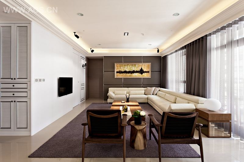 由于是大坪数的狭长房型,所以在公共空间的整合上,显得格外重要,有別于一般常見的客厅主视觉设计。为求充分发挥格局优势,让出沙发背墙, 改以大片落地窗形式呈现,引进最纯粹的自然温度,同时将空间重心移往侧墙,展现优雅细致的独特品位。