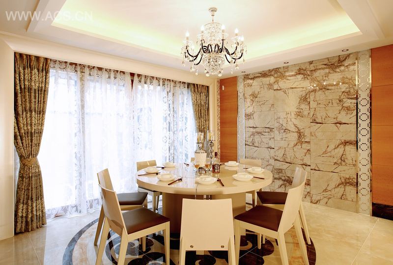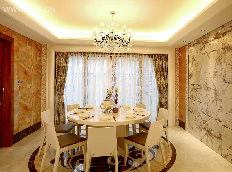 客厅整体呈现的是一种暖黄的色调,温馨典雅。天花干净利落的直线设计,配以雅致的水晶灯,斑驳陆离的红影面板装饰着墙面,地面洁白无瑕的白玉砖,浅卡其色的炫丽家具,无处不彰显着主人高贵优雅的气质。电视墙运用了浅咖啡网大理石框与贝壳马赛克的完美融合,亲近自然,绚丽多彩,更显得空间恢弘大气。卧房区域延续了客厅暖黄与白的融合,但在配饰上更偏向于暖色调,使空间变得优雅清新,温馨舒适。