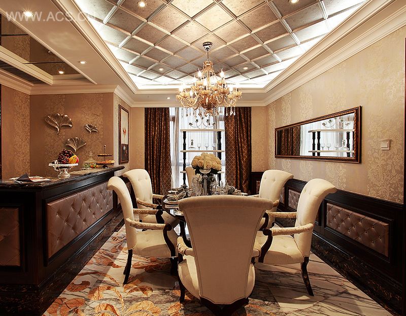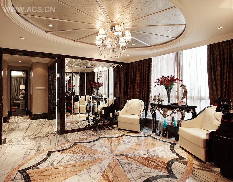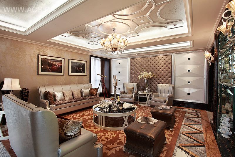 这是一套别具酒店风格的奢华复古居室,屋内大量地运用了大块色系的集合图形,让人感受到华丽曼妙的同时也给予人丰富的想象空间,奢华机制的装饰和家具配上经典的新古典造型摆设、折中。融合古典与现代,奢华与趣味,气派与美感,不期而遇,在看似矛盾与冲突的过程里,浓烈的和谐之感油然而生,成就了新古典与装饰艺术以及巴洛克风格的和谐之美,印证了传统装饰与现代造型设计融合的无限可能,多种艺术风格的有机结合奏响了一曲缤纷的交响乐,让整套居室呈现出奢靡华丽的印象美感。置身于此,让世间繁华融进每一天的平凡生活,独享分外的妖娆。