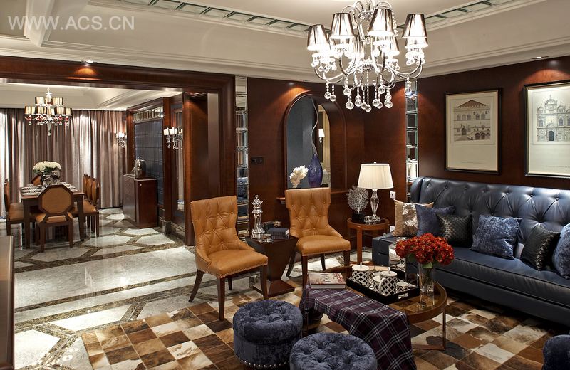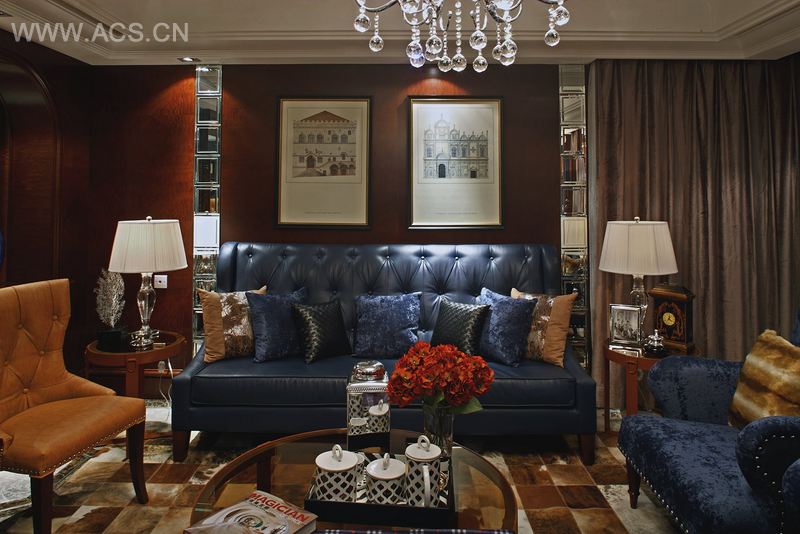 本案以“隐”为主题,以蓝、红、黄为主色调,体现空间庄重、沉稳和品质。深色调的木饰面包围着整个空间,彰显着低调与奢华;落地的咖啡色窗帘将空间与室外隔绝,构成享受生活的境地;主卧的蓝色条纹墙纸与红色皮质床头与客厅的主色调相呼应。纸醉金迷的奢华在此得到了更深层次的收敛,多少追忆的生活场景片段,强烈体验着生活的过程和细节以及高品味而独到的文化艺术感染力,流露着岁月中那份情怀记忆与深沉的浪漫。