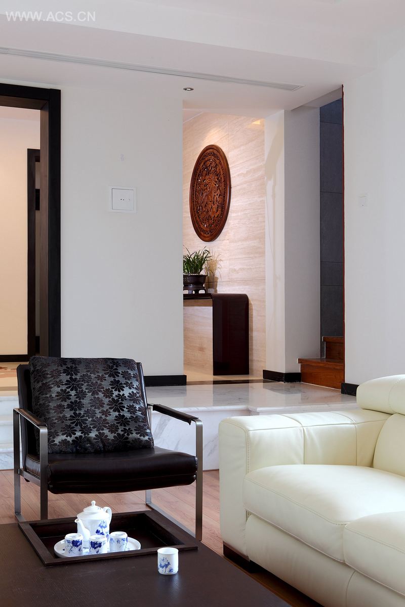 客厅与门厅间原本复杂的台阶设计被整齐化和趣味化后,现代主义的雕塑在这里找到了适合它的家。