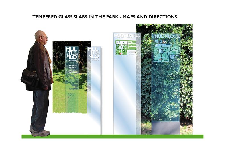 户外的历史花园的导视系统则由大块玻璃制成,上有印上去的图案。