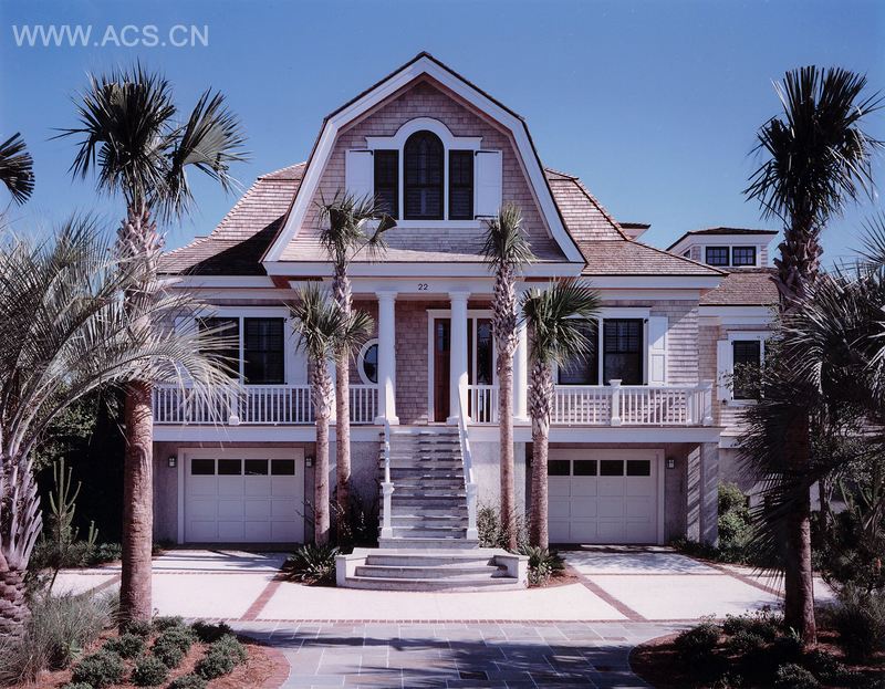 带有复折式屋顶的帕拉迪奥式窗户让位于内陆水路上的海滨房屋的街道。外观