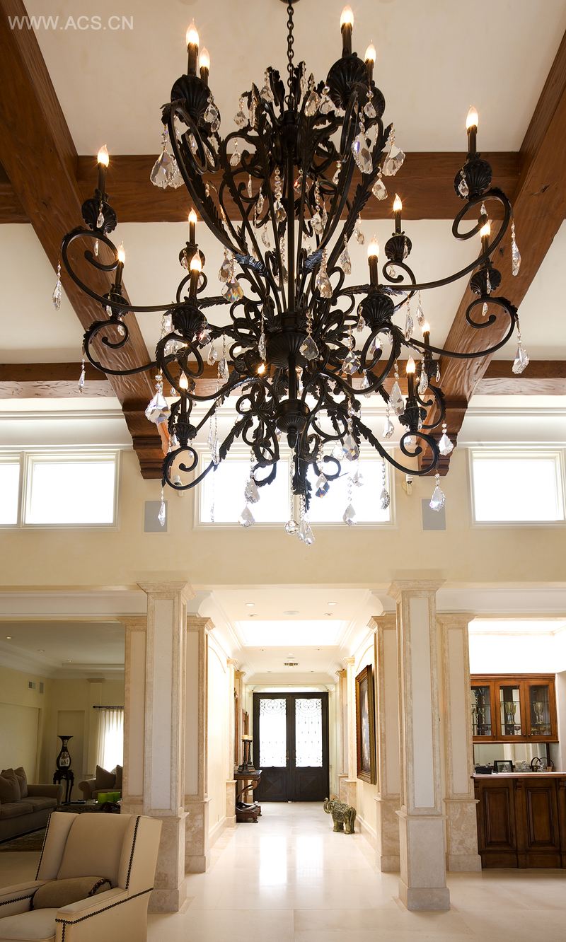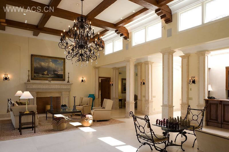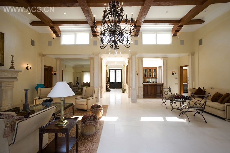这个很有品味的住宅位于山的高处,能够一览海景。从一个圆形车道进入,入口对面是一个手刻石。由青铜和玻璃组成的大门向入口通道敞开,附带一个电动的敞开屋顶。整个一层是由一米的正方形石灰石铺就,一直通向外面一个有屋顶的凉廊。倒影的泳池像个上坡上的悬臂梁一样,三边无边设计。主卧有一个私人会客厅和一个大型更衣室,浴室使用的是希腊大理石支柱和地板。起居室和露台占地1000平方米,配有折中主义的欧式家具。