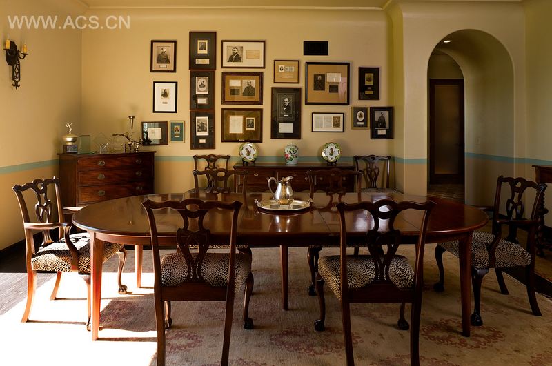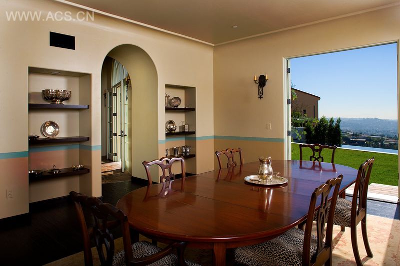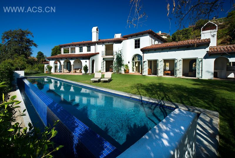 住宅具有典型的西班牙复兴风格,有着白色的灰泥和半圆形拱门。通过凿成的实木门,伴着喷泉温和舒缓的水声可进入有围墙的前花园。建筑形成了一组集成的形状和角度,在东、西、南部打造了独特的凉廊。值得关注的是六角图书馆和双倍高度的入口大厅。凉爽的室内有着宽木板或赤褐色的瓷砖地板,家具为传统的加州风格。厨房在吧台周围设计了一系列的手工个性橱柜。外面是一个长拱形走廊,通向20米的壮丽无边际泳池,能看到洛杉矶令人惊艳的风景。