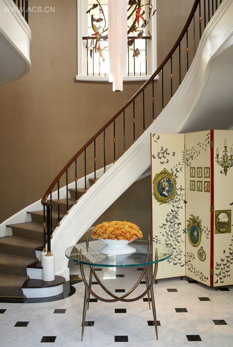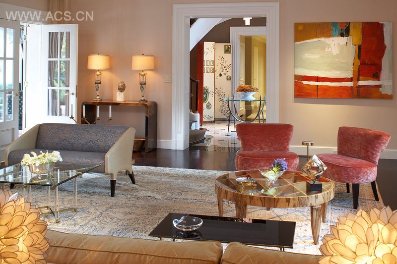家具是从世界各地的古董拍卖会上购得的,包括来自Gio Ponti, Edward Wormley, Piero Fornasetti, Paul László, Edward Wormley, Piero Fornasetti, Paul László, Charles Hollis Jones, and Karl Springer的高级碎片。根据需要,碎片可以被重新修复和装饰,但是很多都还是原封不动的,例如Fornasetti的宝石蓝早餐杯,奇特的海洋生物运动图等。由于这些精美的碎片,而且每一个碎片都有在表面和颜色上进行雕琢,房间就不再是中性的背景。