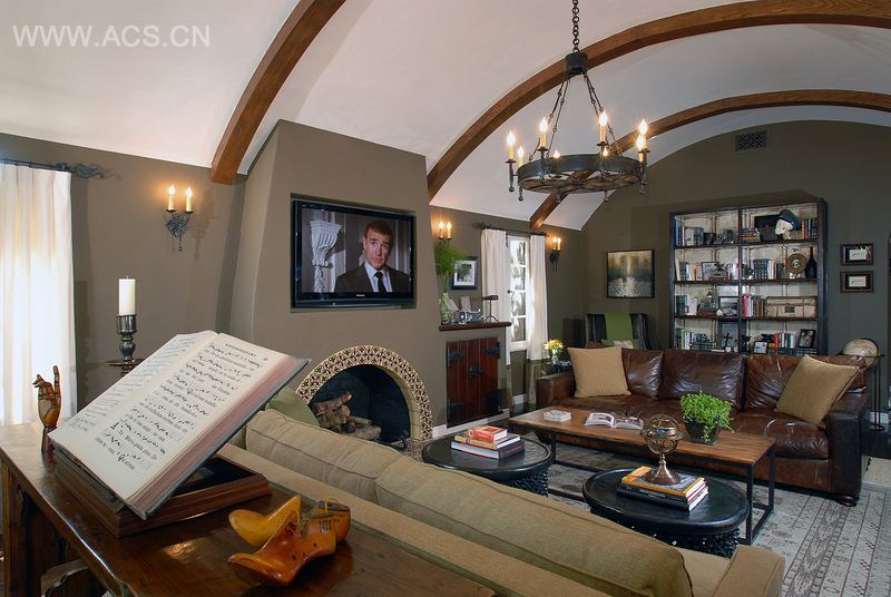 起居室无论是天花板、壁炉还是窗户,都采用了拱形设计,使整个起居室的线条看起来更和谐。家里面还有一个多媒体室,供主人们茶余饭后娱乐。整个室内的设计柔和了各种色彩。