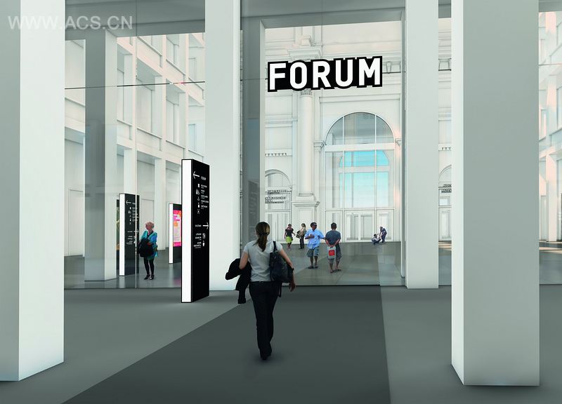 导视系统和信息有意避开所在建筑。作为独立的元素,它构成了架构、企业架构设计、用户和访客的界面,空间悬挂的指示牌、实用的陈设和独立的信息牌黑白相间,部分则可发光。他们位于浅色调的建筑中,但达到最佳的认可度和效果,远远就能看到。