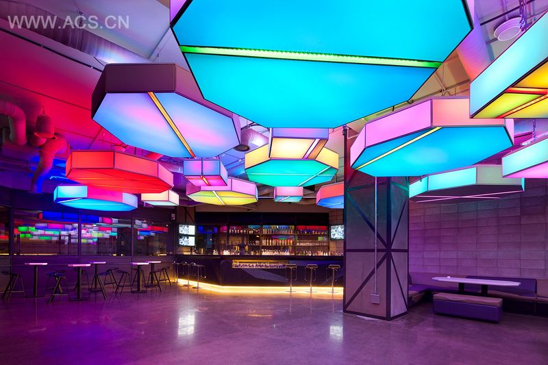 八边形俱乐部的特别休息室是一个与主大厅分离的空间。这个区域首先安装了音频感应 4D 媒体照明灯,设计也以URBANTAINER. 采用的八边形图案为基础。