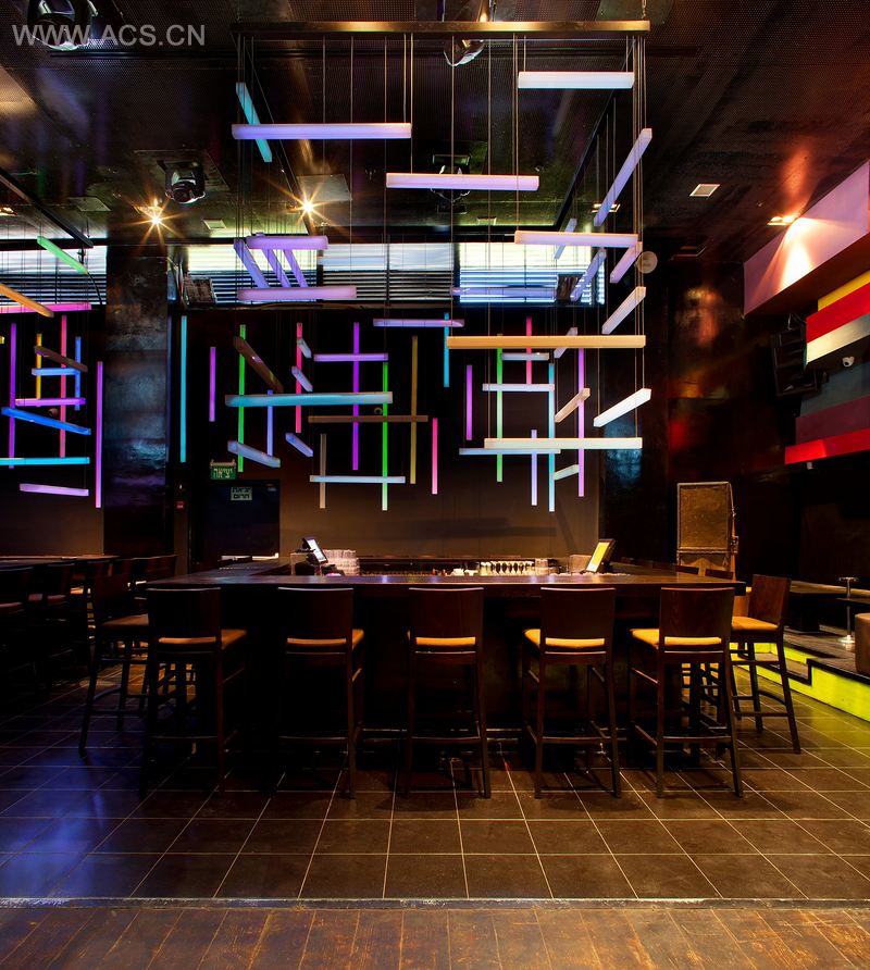 由于这个地方的照明系统满足一个花哨的、热烈的、活泼的空间的所有需求,它易于变成小俱乐部;当灯光暗下去,空间内的大椭圆灯光元素以及移动像素光线为酒吧客人带来置身夜总会的感觉。
