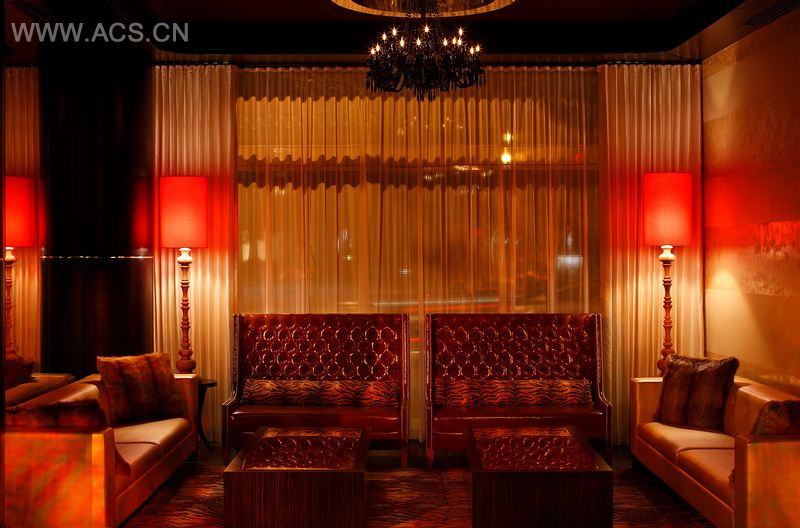 我想要Vanquish 酒吧有一种古琦专卖店的感觉。我使用超大的黑鸡翅木支柱以及定制的、低端上釉、无缝的黄色玻璃面板来隔离开豪华的坐席,隔开空间。在每一个坐席区域的天花板上,我在铬合金鼓励放了黑色的吊灯。