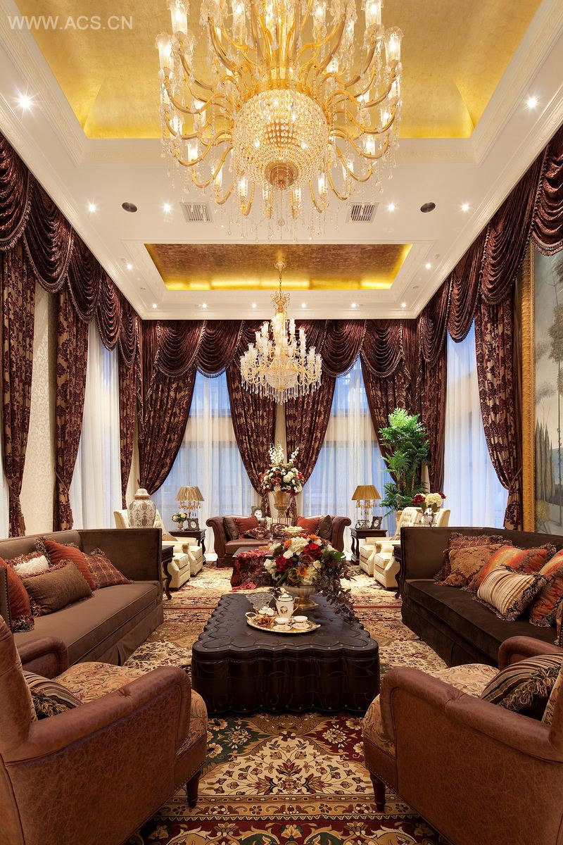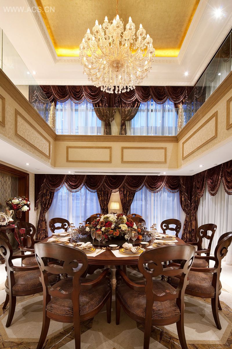 整个室内空间以暖色调为主,平面布局的通透让有限的空间得以延伸。客厅大面积使用米黄洞石,暗红色花纹墙纸,配以金漆的天花及水晶灯,体现出低调奢华的气质。与欧式相框刻画的背景配合略带美式田园的家具,有浪漫氛围。