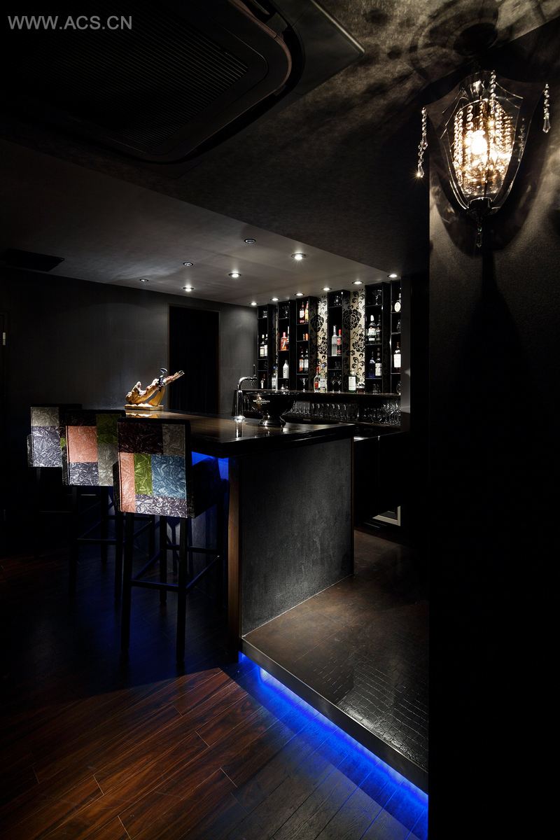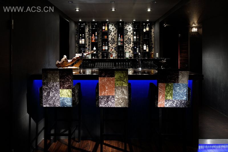 酒吧里的任何一个位置都可以看到吧台位置。吧台位置的后墙以及瓶架设计很是独特。我们有意把这里设计的很明亮,即使少量客户在这儿的时候也能够给人深刻印象,具有象征意义。