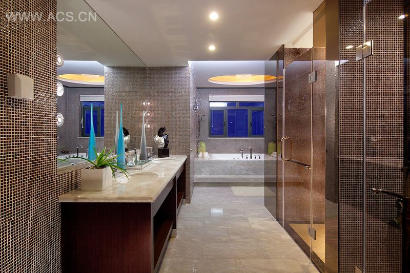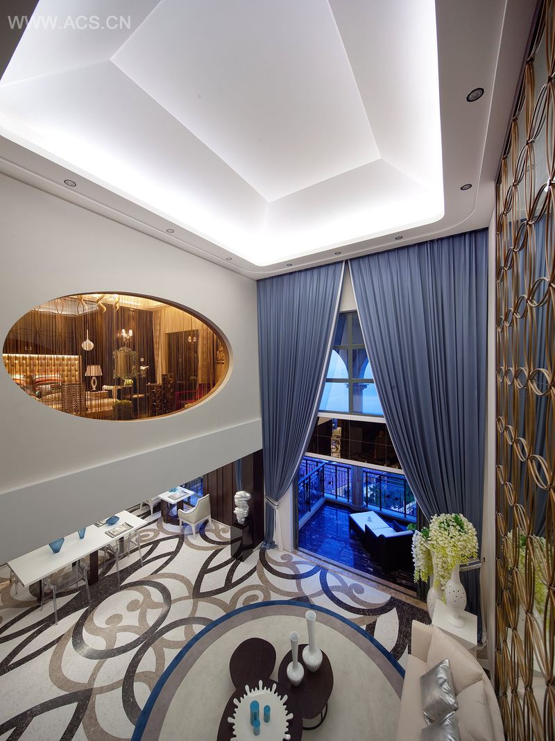 在功能佈局上採用了開放式和波浪型线条相結合的手法來劃分區域,讓空間通透明亮,同時也不失浪漫的生活情趣。推开大门,映入眼帘的波浪形隔墙,蜿蜒而上的楼梯,以弧为构成,弯延伸展回旋仿佛让人至身于大海,浩瀚无穷。运用高档的鸡翅木,简洁的灰茶镜,如水珠般的墙纸,使整个空间更为开阔、晶莹、通透。客厅与楼梯下的水景相连,配以热带标志性花卉,随着缓缓的流水,以及水面飘动的花瓣为空间增添休闲浪漫放松的度假居所。