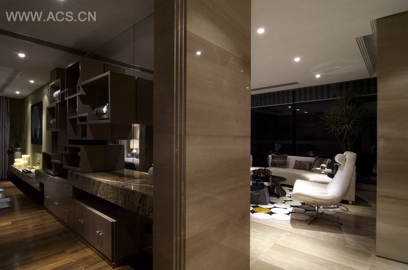 设计师借助多种不同的元素来打造空间的每个视觉点和面,在不同的视觉结构中,力求凸显出空间的完整性和饱满感。客厅中将光线进行很好的“收藏”,凸显出空间的明暗对比感,增强空间的张力感。意大利木纹多带来的不仅仅是清晰和时尚,一同散发、萦绕在空间中的,还有几分空间于业主头脑中所形成的的清新感想和对生活的美好向往。客厅中主要的色彩以皮质沙发、玻璃桌、灰白沙发抱枕为基调,在此形成了适合业主特性的稳重感和低调的奢华感。