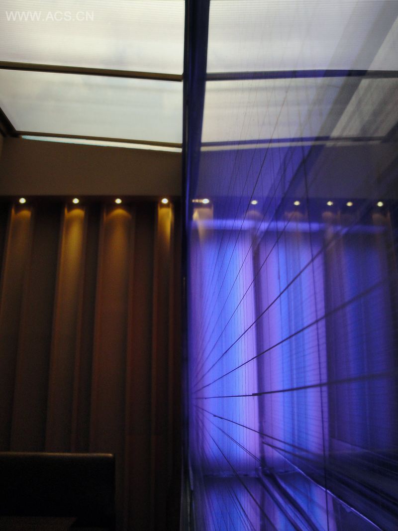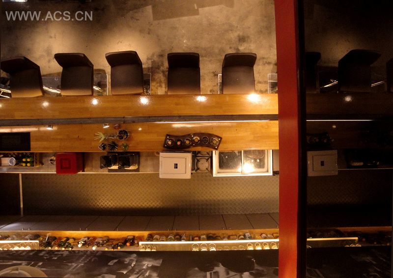 我们以一种很强的几何学态度对墙体和地面进行处理。家具的选用以尽量简洁严谨为主。长形吧台上的不锈钢灯具经过特殊设计,成为对线形空间的一种强调。在这些突出元素中,有一些令人惊喜地体验和谐地融入其中,加强了酒吧的整体氛围。吧台后方的壁画由艺术家 Joanna Burtenshaw 绘制,如一面镜子般展示了酒吧中欢快的人们。后墙上客户定制的灯箱参照了James Turrell 的灯具装置。由对立放置的镜子创造出的不同阴影和视觉空间深度很好地配合了气氛照明,为酒吧的尽头带来了非凡的体验。