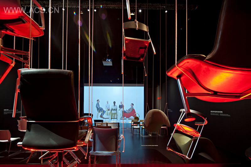 它们在180平方米的展厅之中,在聚光灯之下按照设计时间的先后顺序而排列。Kusch + Co的经典之作以红光作为强调,被悬挂在了镜面墙的前方,形成了一个经典作品的展览馆,是剧场正厅一排又一排椅子的延续。跟历史背景相对立,如今变成可触知的。参观者他们自身也与舞台布景融为一体,在舞台上与椅子站在一起,并被邀请入座。舞台变成了观众。