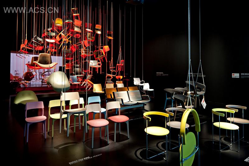 电影将这些椅子系在了故事当中。在这些小短片里,参观者感受到这些椅子就是主角。它们变得活跃了,它们将自己的角色从支撑物转变成主要演员。六到七米高的镜子将这些故事反射到了展厅之中。故事里的空间变成了逼真的场景。
