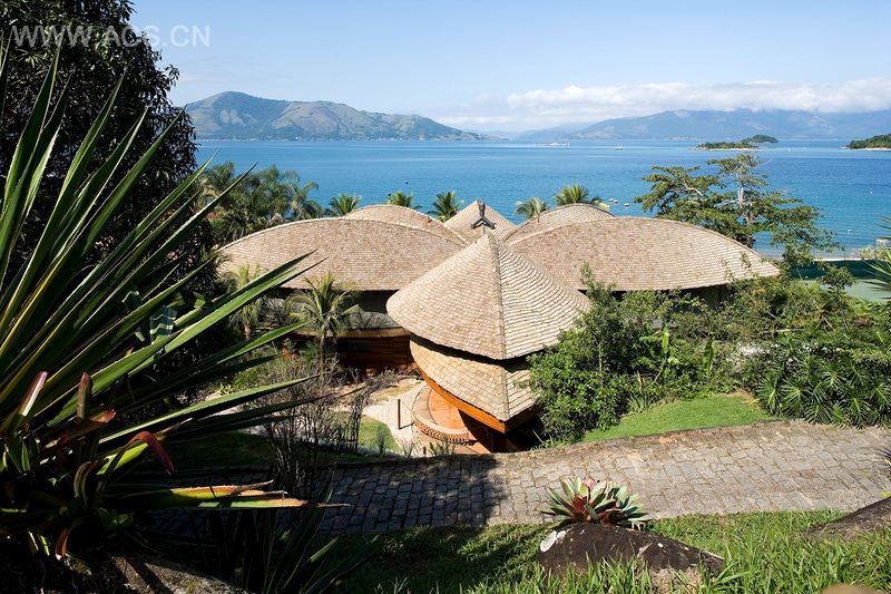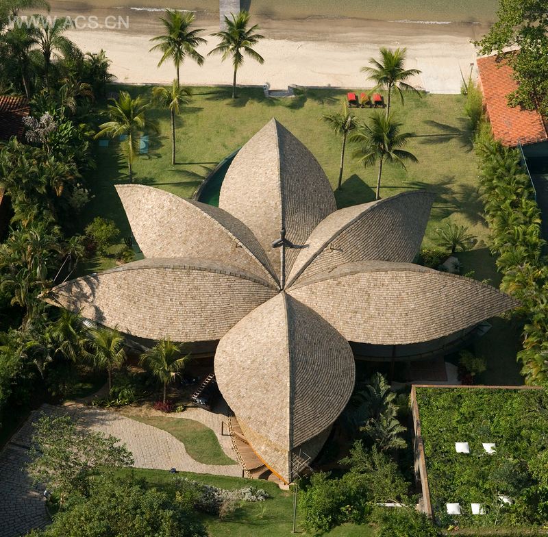 这个项目的灵感来自于巴西的印第安建筑,非常适合当地炎热和潮湿的气候。叶子屋屹立在安格拉杜斯雷斯,距里约热内卢仅一小时车程。屋顶为硕大的叶子,使房子封闭的空间不受灼热的太阳的伤害,构成中间的、最重要的开放性空间。这些中间的开放空间代表了设计的精华。它们是屋主和客人大多数时候所待的社交区域。这些空间比较高,高度从3米到9米不等,允许海上来的东南信风极好地穿过建筑,提供了自然空气流通,并给封闭和开放的空间带来凉爽的气息。我们认为这是采用低科技达到了最大化的生态效益,而这正是该建筑设计的理念。幸运的是我们的实践受到客户的认可,理解热带海滨别墅可增加人与自然之间的互动的这个想法,尽可能地尝试不要将二者完全分离。该住宅没有走廊,内外几乎融合。许多滑动门大多数镶有玻璃,打开了封闭的空间,可以让海风吹进室内。一层的景观无处不在,弯曲的游泳池则迂回前进至室内。正式饭厅下面有一个养了水生植物和鱼类的池塘,延伸至后“阳台”,阳台有五个巴西的印第安风格的吊床,可供休息。我们称这个空间为“巴西休息室”。屋顶结构是由叠层木板(eucaliptus)制成,这种木板有着精致温馨的美感,并可以有很大的跨度(这里最大的跨度是20米)。屋顶以小造林木砖(pinus taeda)覆盖,很容易配合复合的表面。它还通过中央的钢柱收集雨水,用来浇灌园林和冲洗厕所。所有的建筑、室内表面,除了本来就有的玻璃和预氧化铜覆盖外,都以该选址的灰色瓷砖石材、竹网、当地人工造林出产的木材、朴实的地板和旧电杆回收利用的木材作最后的修饰。自然材料的使用、透明的玻璃、流行的绿色景观设计相关的中性氧化铜等种种房子的有机美感和丰富多样的纹理和节奏,打造了一个非常理想的住宅:它就属于这个地方,呼应了生机盎然的巴西大自然。