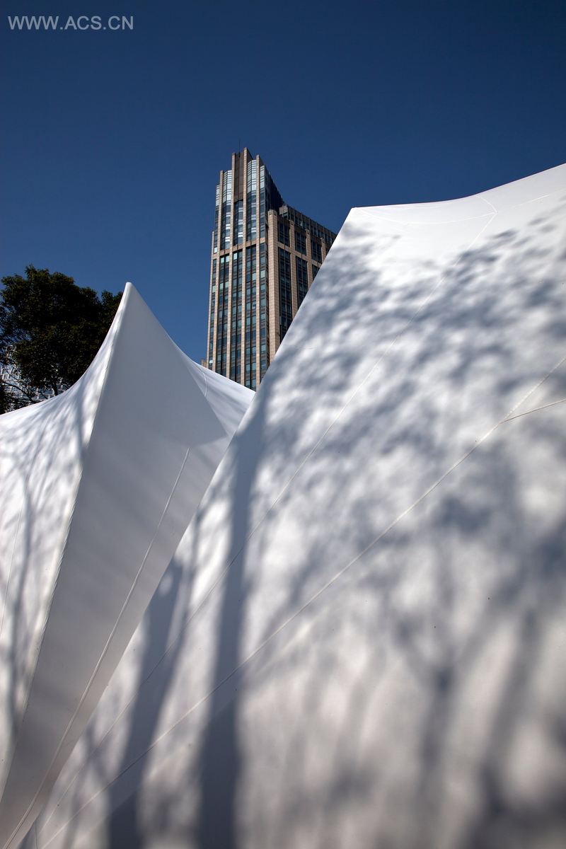帐篷的材料是绷紧的、有弹性的半透明防水材料,以钢作为结构材料。帐篷的材料由美国原棉(COTTON USA)提供,而且还是低碳迹环保产品,它能十分易于安装和重新使用,形式多变。