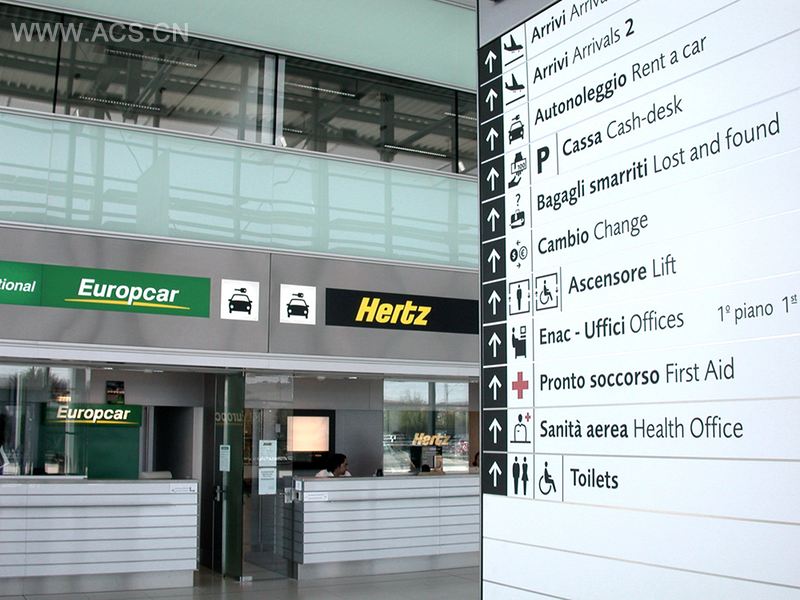 安科纳·法尔科纳拉机场曾有着量身定制的系列引导标识,即协调的图标、字母,它们作为国际语言通用,出现在所有机场制作的匾额、指示牌、面板等书面信息中。