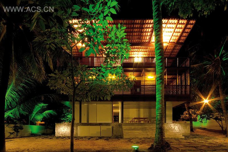 住宅共有三层,是三个用途完全不同、也以不同方式接近大自然的景观。第一层:墩座,和街道在同一层,俯瞰着花园。两个建筑体量处于上面房子的阴影下,兼具遮蔽功能,营造了一个持久的开放空间,它能看到花园大部分。第二层:通过走廊可以到该层的房间,房间外以木材包裹,考虑了私密性、视野、自然通风和阴影。阳光下的阴影被当成生活的点缀。白墙上有粗糙的手工砖。第三层:客厅是一个在树上的、在混凝土屋子顶部的木屋。开放的屋顶为3.2米高的玻璃面板留出空间,椰子树、沙丘和海洋在开放式室内形成视觉上的交融。