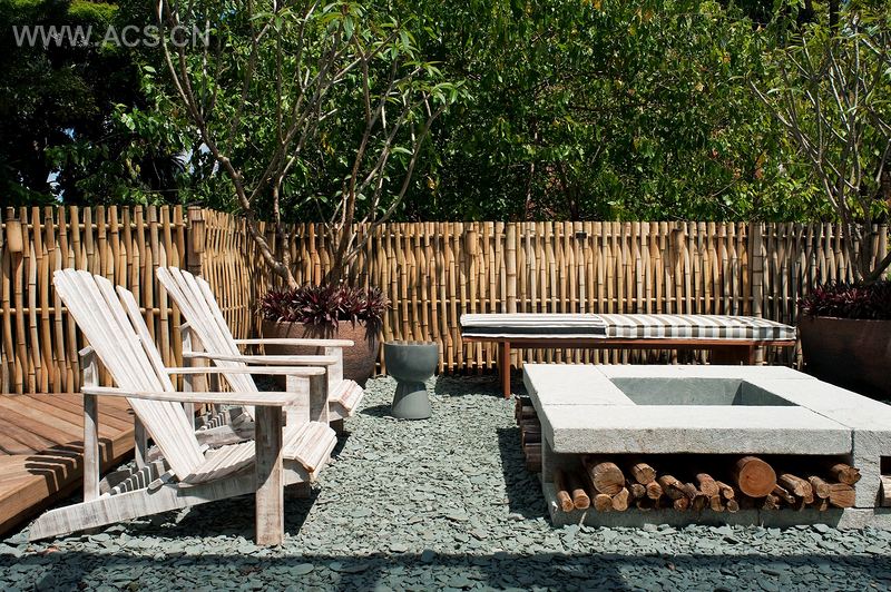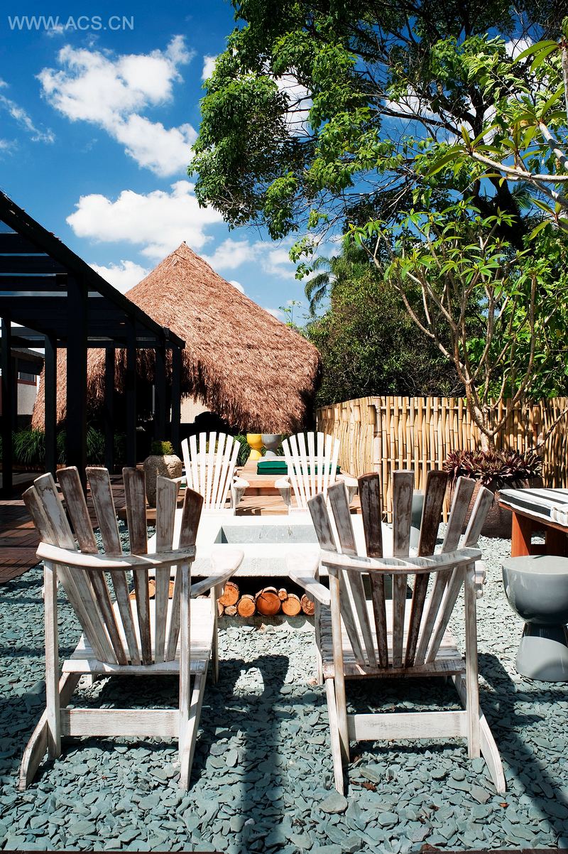 小屋用手工建造,使用蒸压竹,并以棕叶纤维稻草(巴西天然纤维)覆盖,地板由通过认证的木材制成。它的形状不同寻常,还有屋顶下令人惊喜的5米净空,邀请访客进入到客厅。连接内部和外部的区域有一个60平方米的特殊设计平台空间,它的灵感来自巴西印第安部落篮子内发现的木板。该区域散放着彩色的垫子,中央则为一个皂石做成的燃池。装饰综合了棉和粗木家具等天然纺织品。空间的亮点在于西面的汉斯•维格内科的扶手椅,设计流畅,并设计了一些复杂的细节。净空的九簇悬挂的稻草把它变成了一个舒适的地方。该建筑除了可持续的特点外,还确保了适宜的室温,冬暖夏凉,不受强风的影响。